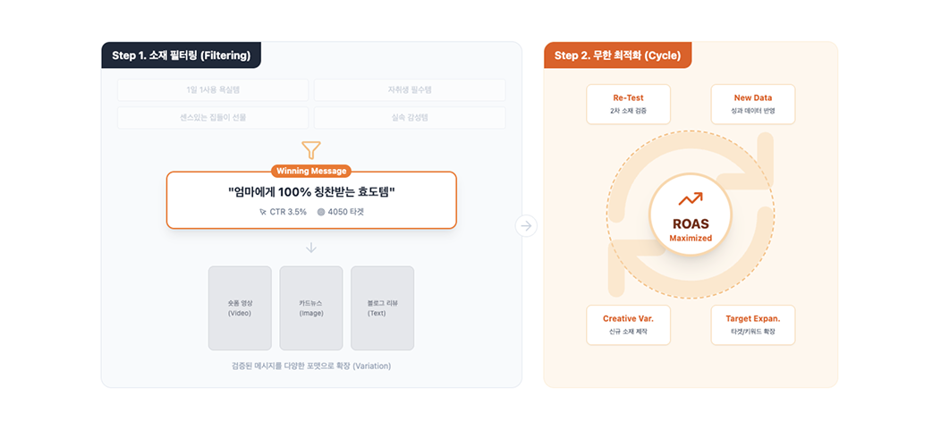 오가닉 데이터로 1차 검증된 소재만 투입해 예산 낭비를 막고 효율 극대화 위닝 소재 기반의 지속적인 성과 검증 루프를 통해 광고 효율 최적화
