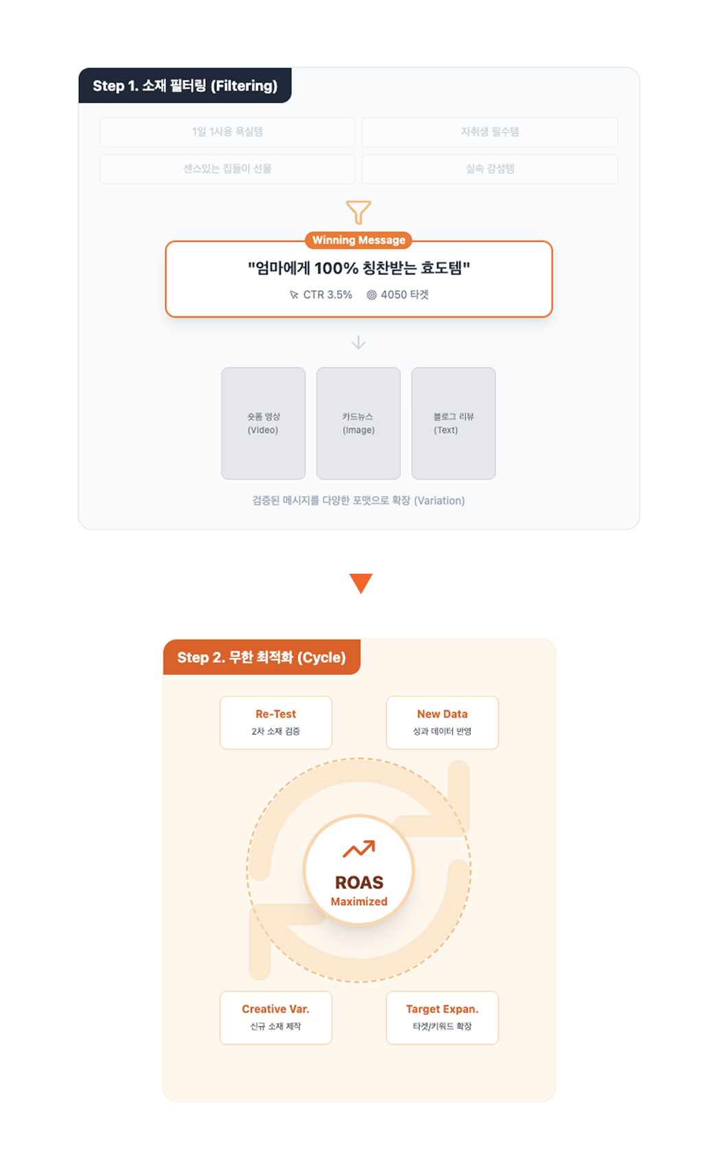 위닝 소재 기반의 지속적인 성과 검증 루프를 통해 광고 효율 최적화대
